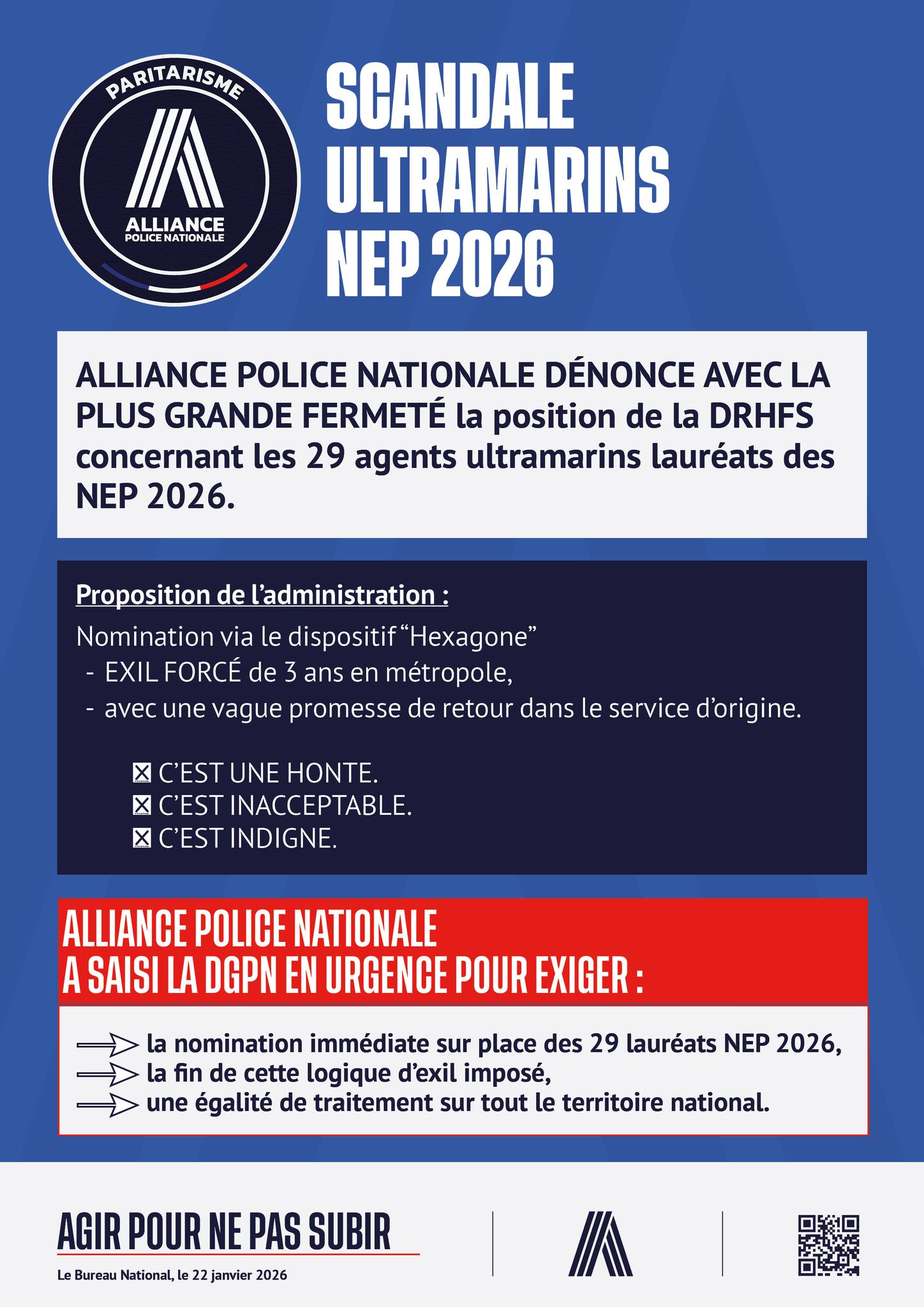 ALLIANCE POLICE NATIONALE DÉNONCE AVEC LA PLUS GRANDE FERMETÉ la position de la DRHFS concernant les 29 agents ultramarins lauréats des NEP 2026.