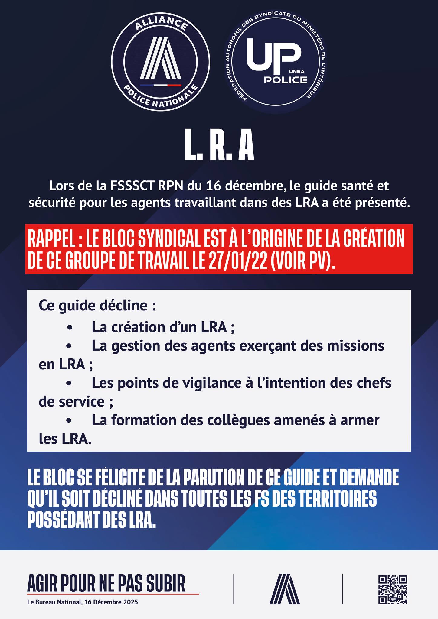 FS SSCT RPN LRA Publication : 16 décembre 2025 Catégorie : Motocyclistes L. R. A Lors de la FSSSCT RPN du 16 décembre, le guide santé et sécurité pour les agents travaillant dans des LRA a été présenté. Rappel : le bloc syndical est à l’origine de la création de ce groupe de travail le 27/01/22 (voir PV). Téléchargement Partager ce contenu Whatsapp PAF, Bureau National