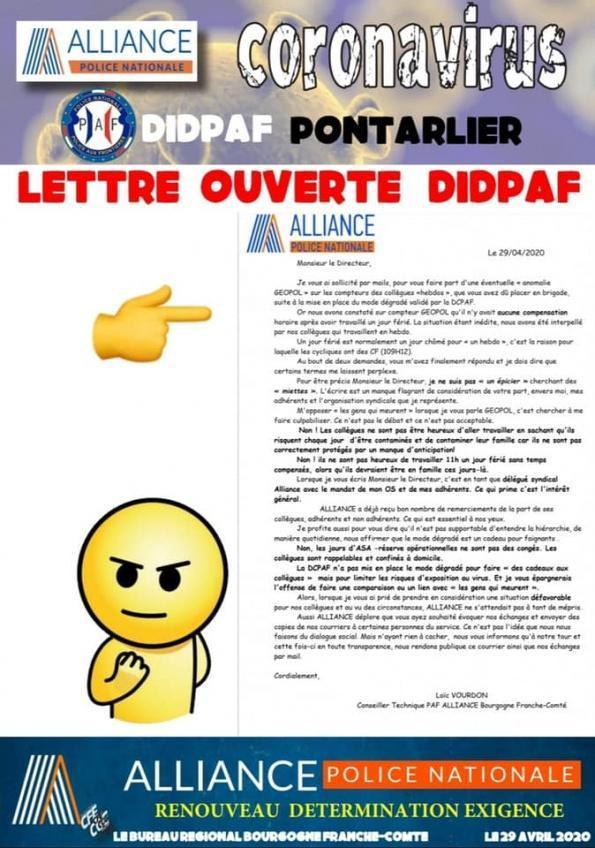 CORONAVIRUS DIDPAF PONTARLIER LETTRE OUVERTE DIDPAF Publication : 29 avril 2020 Lire la suite... Bureau Régional
