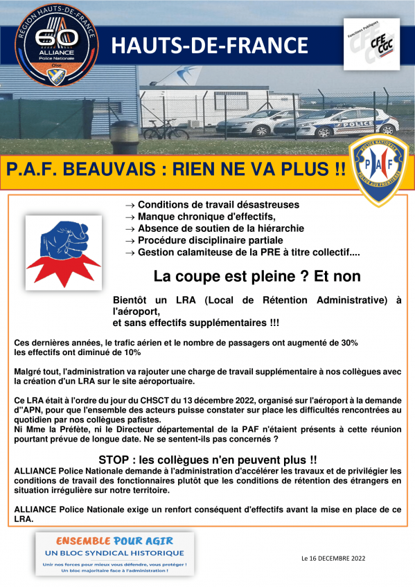 PAF BEAUVAIS : P.R.E. COLLECTIVE Le départemental adjoint ALLIANCE Police Nationale a été reçu le 14 décembre 2022 par M. NAHON, DZPAF afin de dénoncer la gestion calamiteuse de la P.R.E. à titre collectif attribuée à la BMR Beauvais et l'UCT Beauvais... Publication : 20 décembre 2022 Lire la suite... PAF, Oise