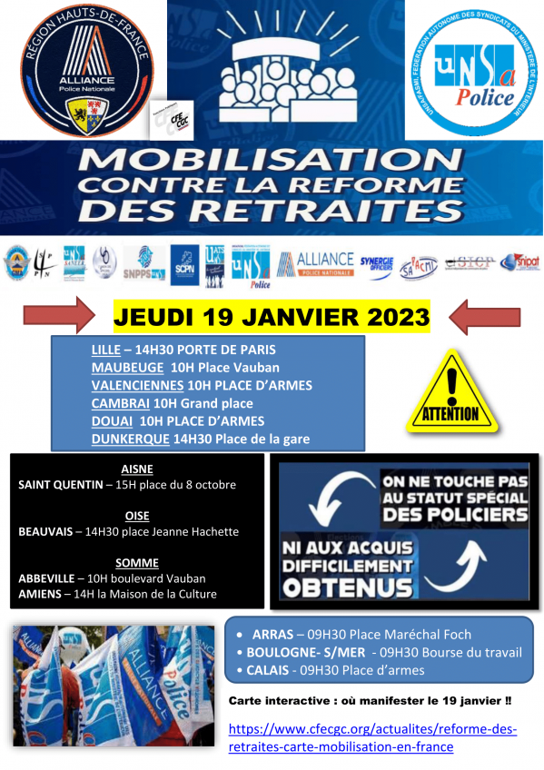 REFORME DES RETRAITES ! JEUDI 19 JANVIER 2023 MOBILISONS NOUS TOUS LE JEUDI 19 JANVIER 2023 ! CONTRE LA REFORME DES RETRAITES... Lieux de mobilisations... Publication : 13 janvier 2023 Lire la suite... Aisne, Nord, Oise, Pas de calais, Somme, Bureau Régional, Hauts de France