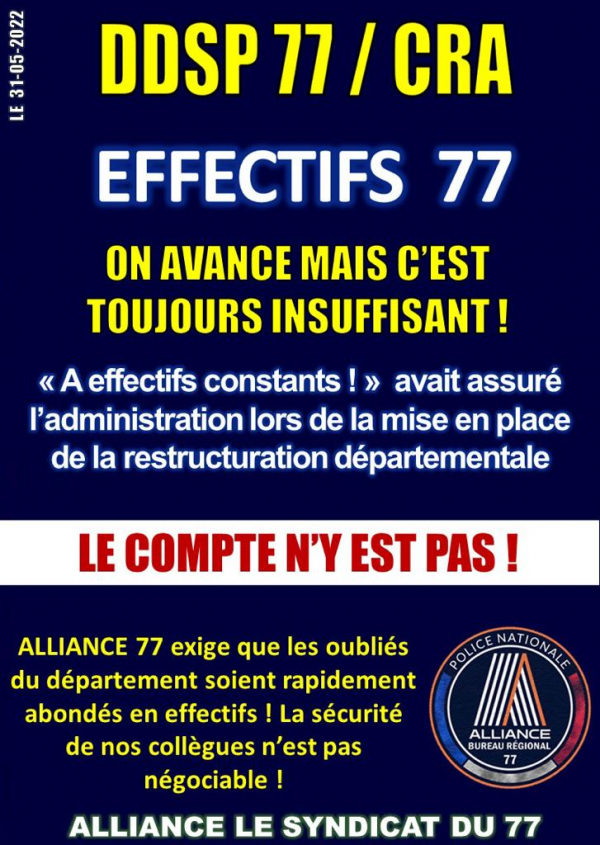 🚨🚨EFFECTIFS DDSP 77 🚨 CRA 77 🚨 Publication : 1 juin 2022 Lire la suite... Seine et marne, Bureau Régional